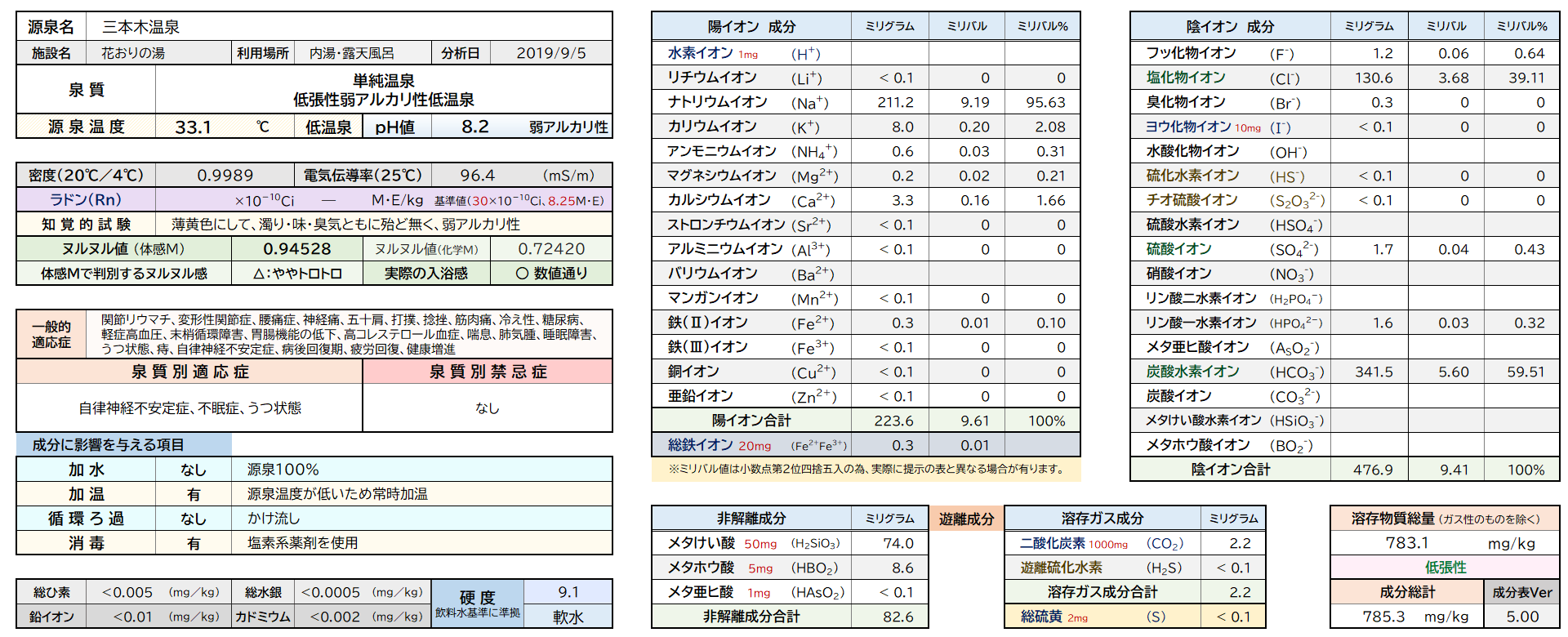 炭酸水素イオン(重曹)がやや多めなので、かなりサッパリ系の温泉で、夏場に良さそうですね。