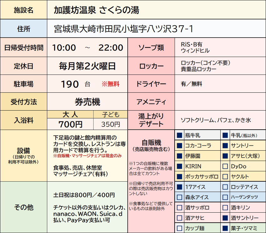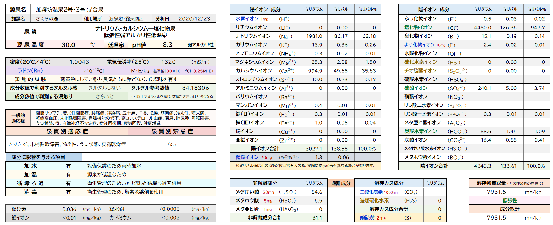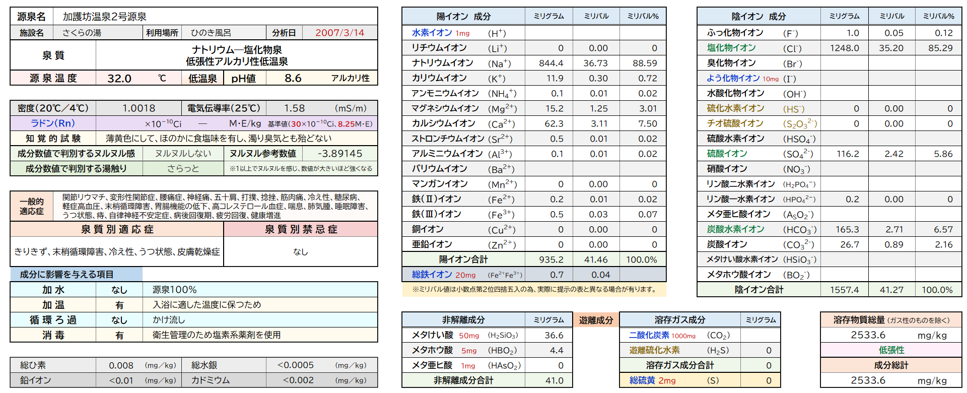 塩化物泉大崎市宮城県 岩風呂露天風呂 塩化物泉 2025.09.262025.10.03 加護坊温泉 さくらの湯 番号 140 県市 大崎市 基本情報 成分表1 成分表2 成分表3 成分表4 成分表5 総評