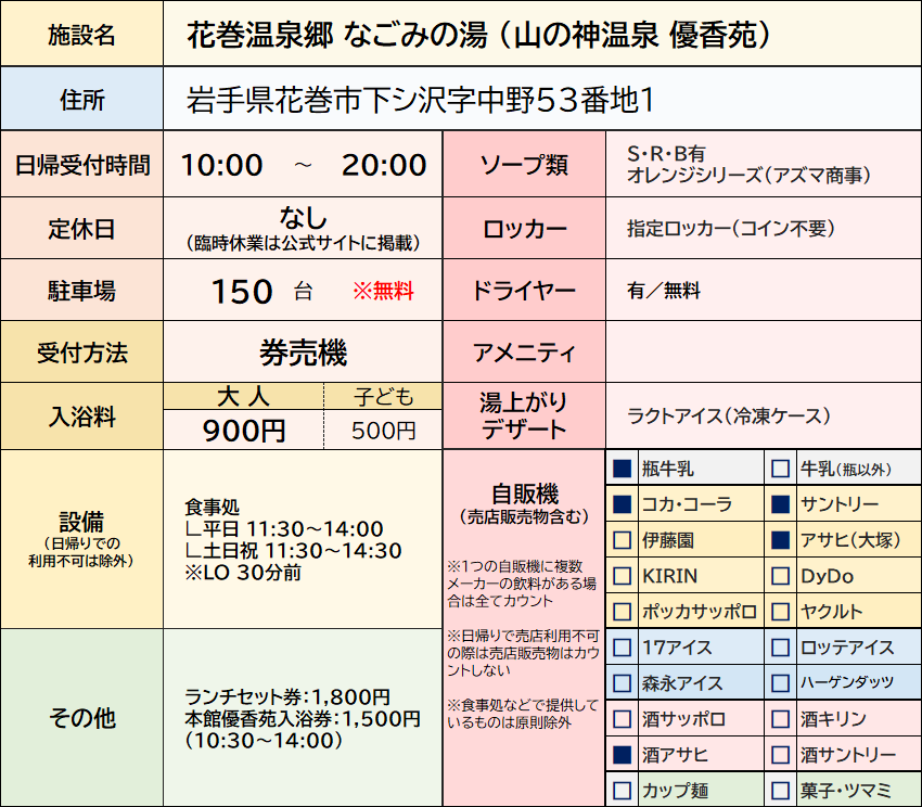 アルカリ性イチオシヌルヌル単純温泉岩手県稀少泉質花巻温泉 露天風呂 アルカリ性 2025.09.262025.10.03 なごみの湯 番号 146 県市 花巻市 基本情報 成分表1 成分表2 成分表3 成分表4 成分表5 総評