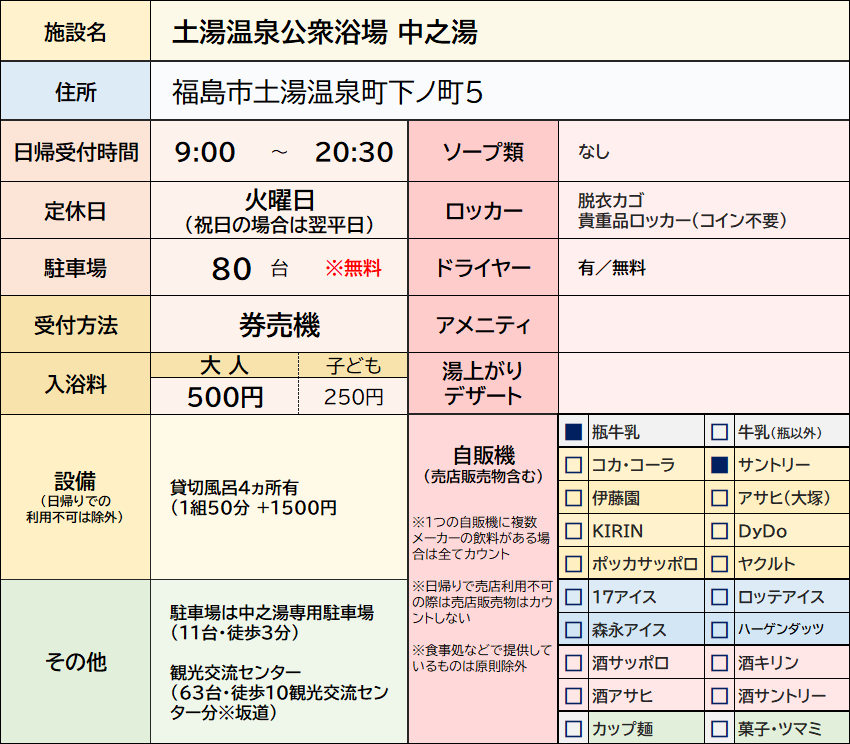 アルカリ性ヌルヌル単純温泉土湯温泉塩化物泉炭酸水素塩泉硫酸塩泉福島県 露天風呂 アルカリ性 2025.09.262025.10.03 土湯温泉 公衆浴場 中之湯 番号 148 県市 福島市 基本情報 成分表1 成分表2 成分表3 成分表4 成分表5 総評