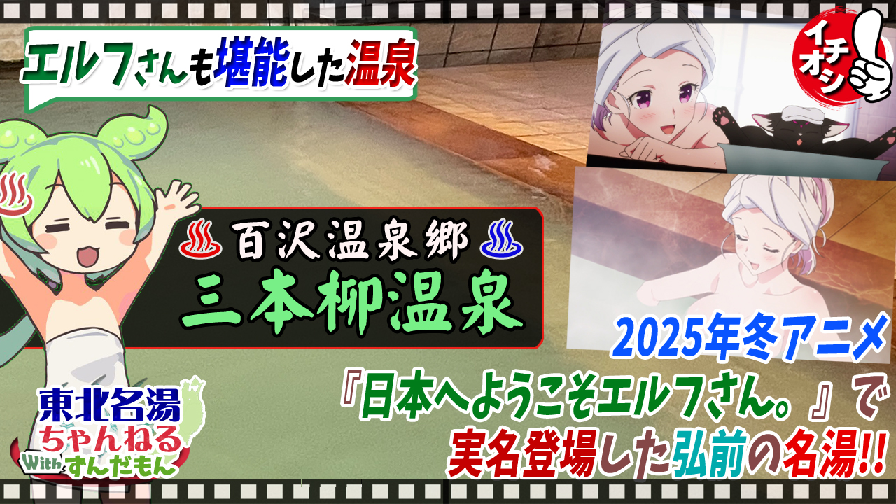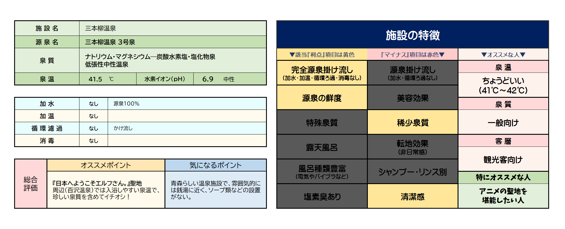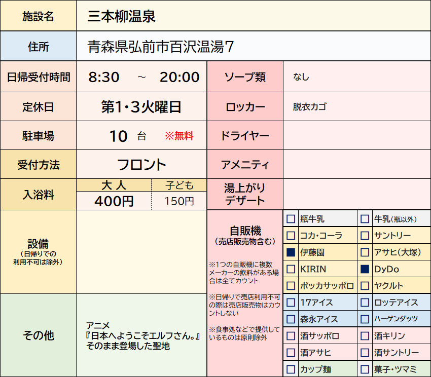 アニメ聖地イチオシ塩化物泉完全源泉かけ流し炭酸水素塩泉百沢温泉稀少泉質青森県 アニメ聖地エルフ日本へようこそエルフさん。 アニメ聖地 2025.09.262025.10.03 三本柳温泉 番号 151 県市 弘前市 基本情報 成分表1 成分表2 成分表3 成分表4 成分表5 総評