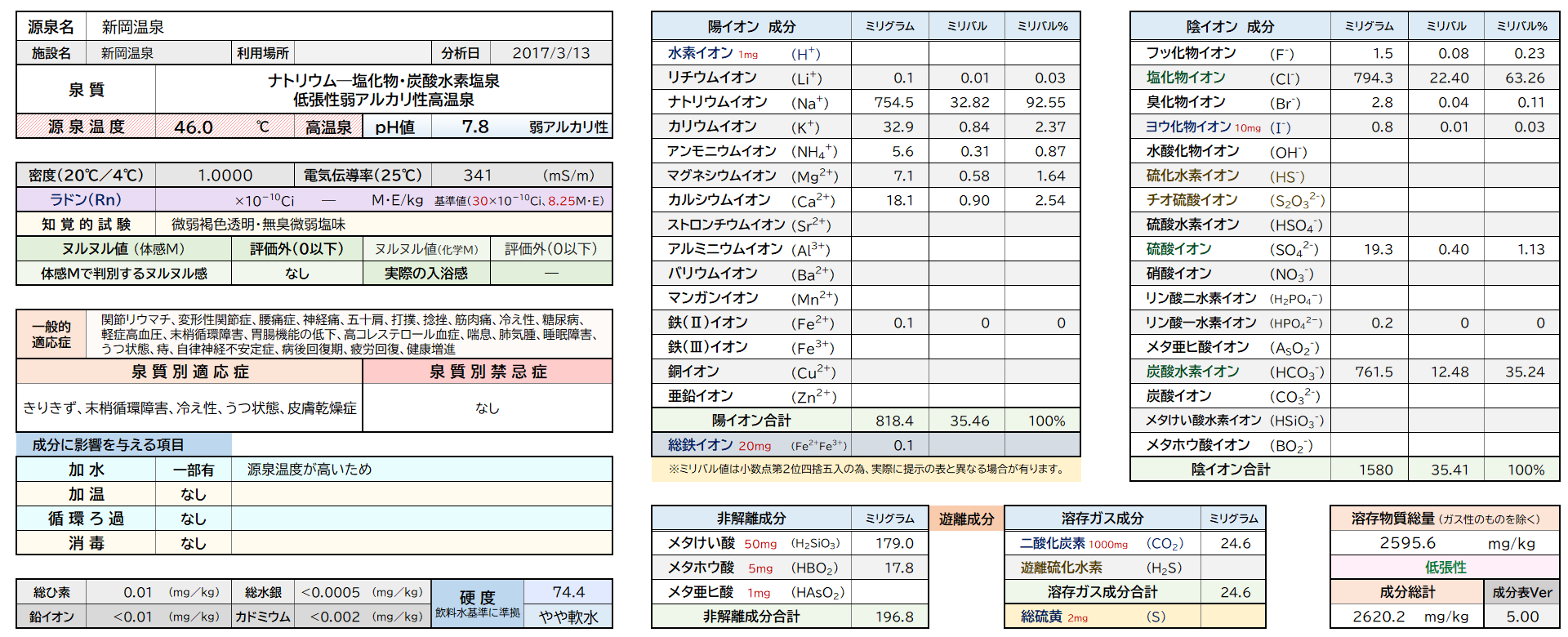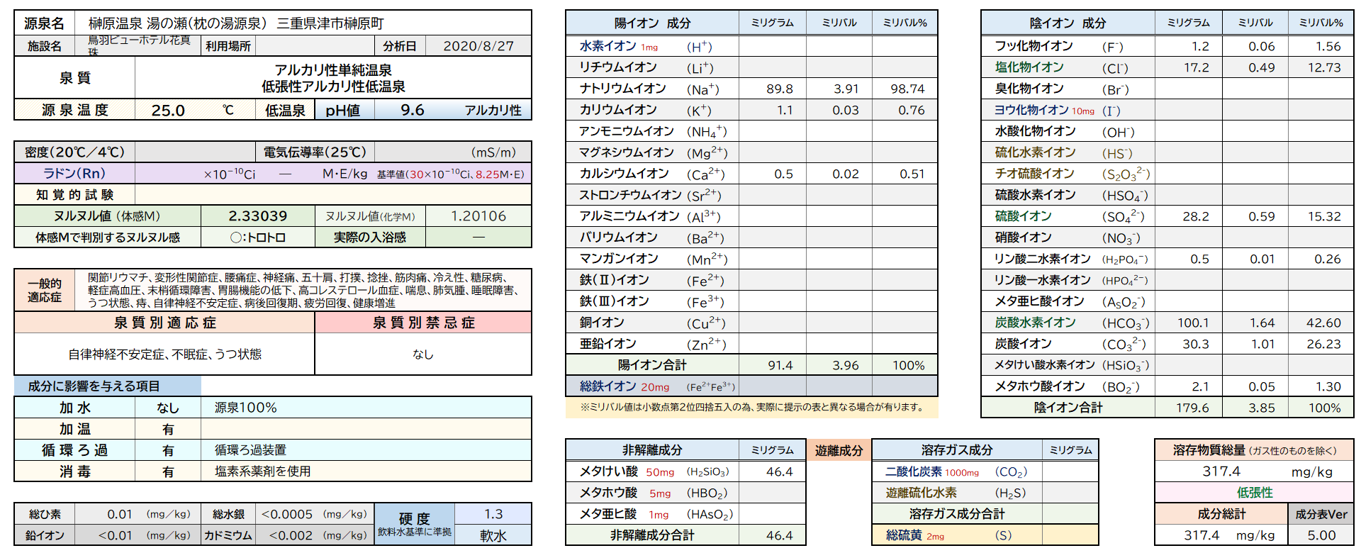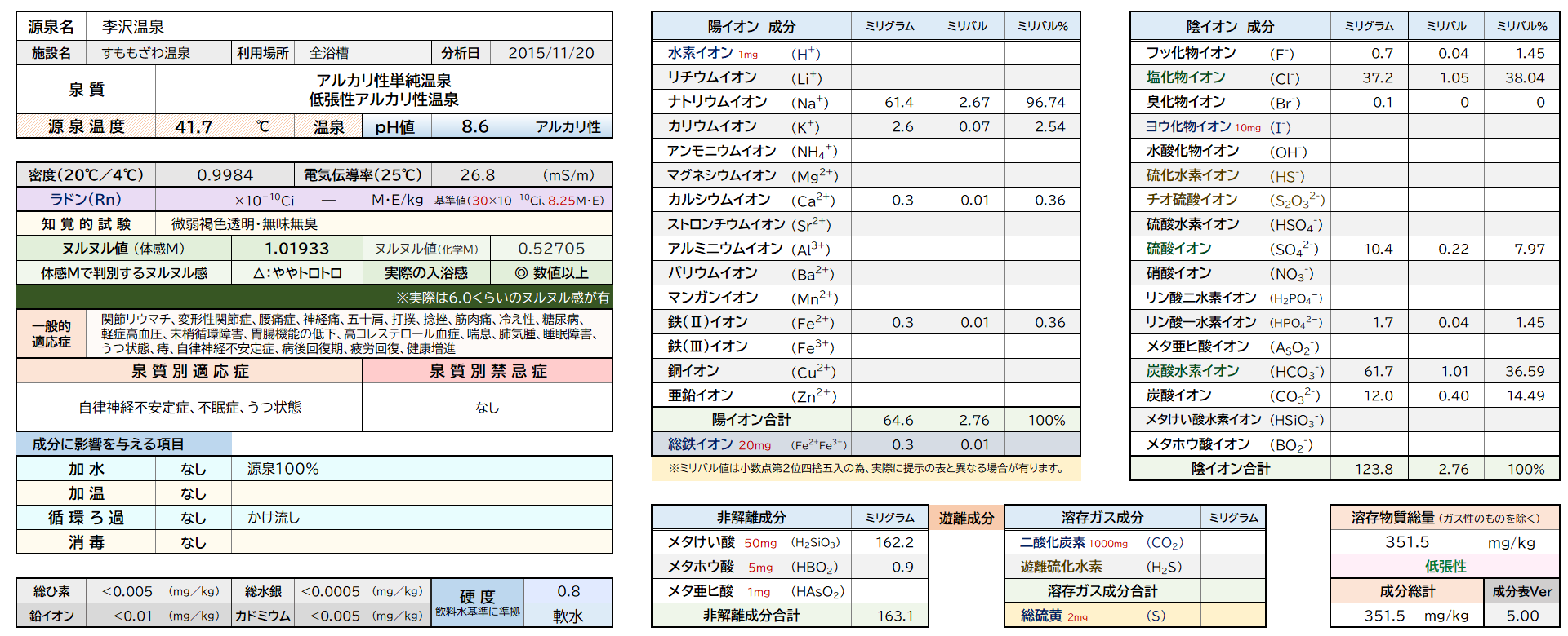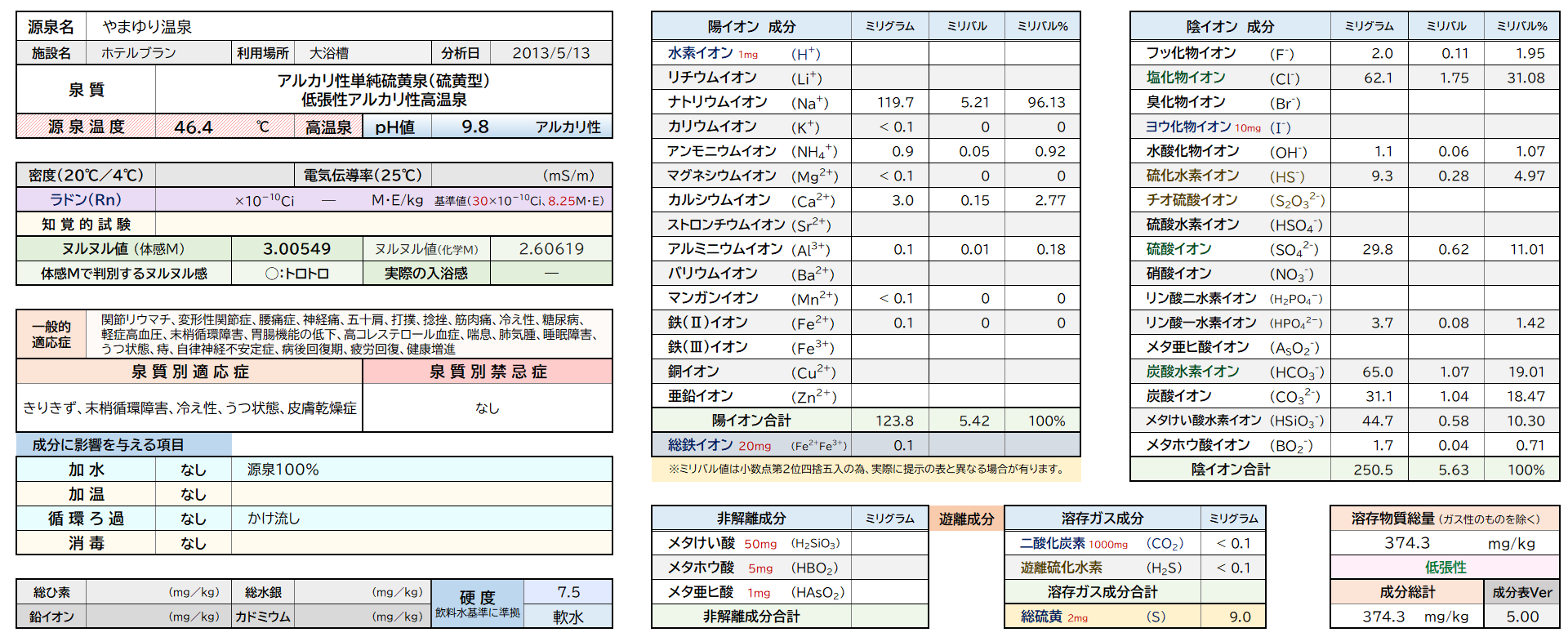 まだまだ紹介できていない施設が多い為、とりあえず測定のために作った成分表を置いておきます。