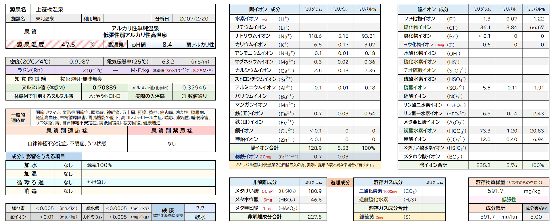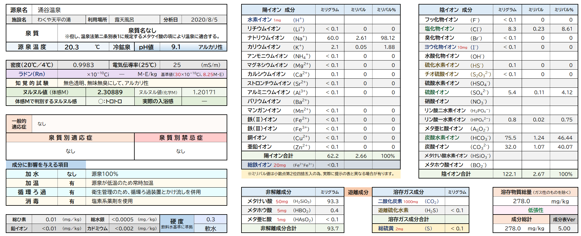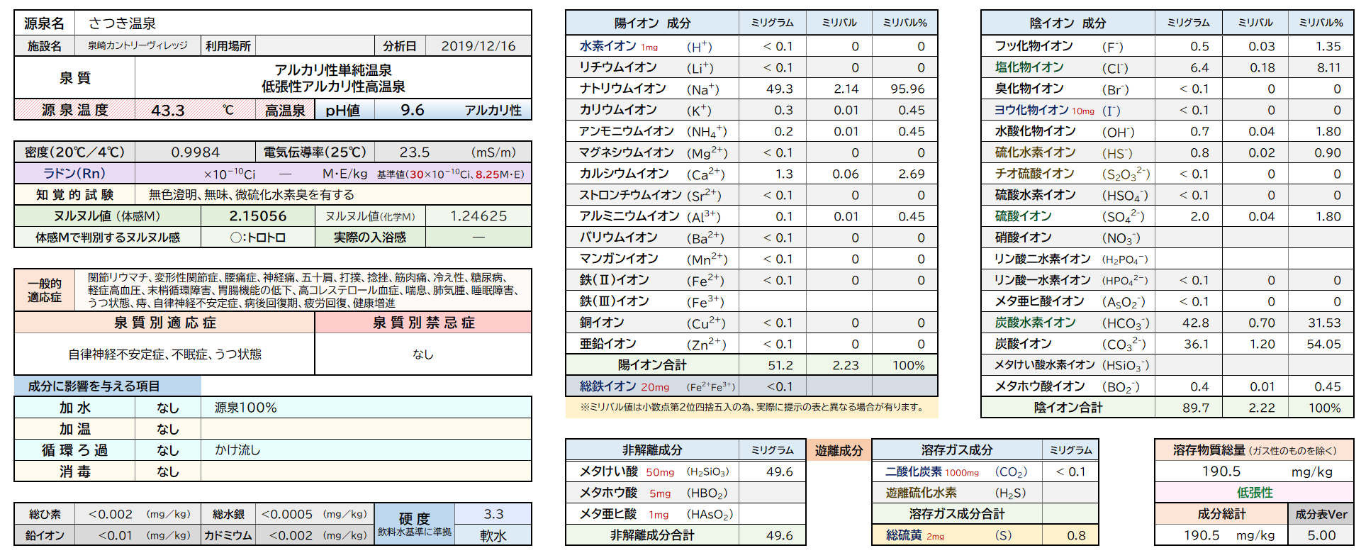 まだまだ紹介できていない施設が多い為、とりあえず測定のために作った成分表を置いておきます。