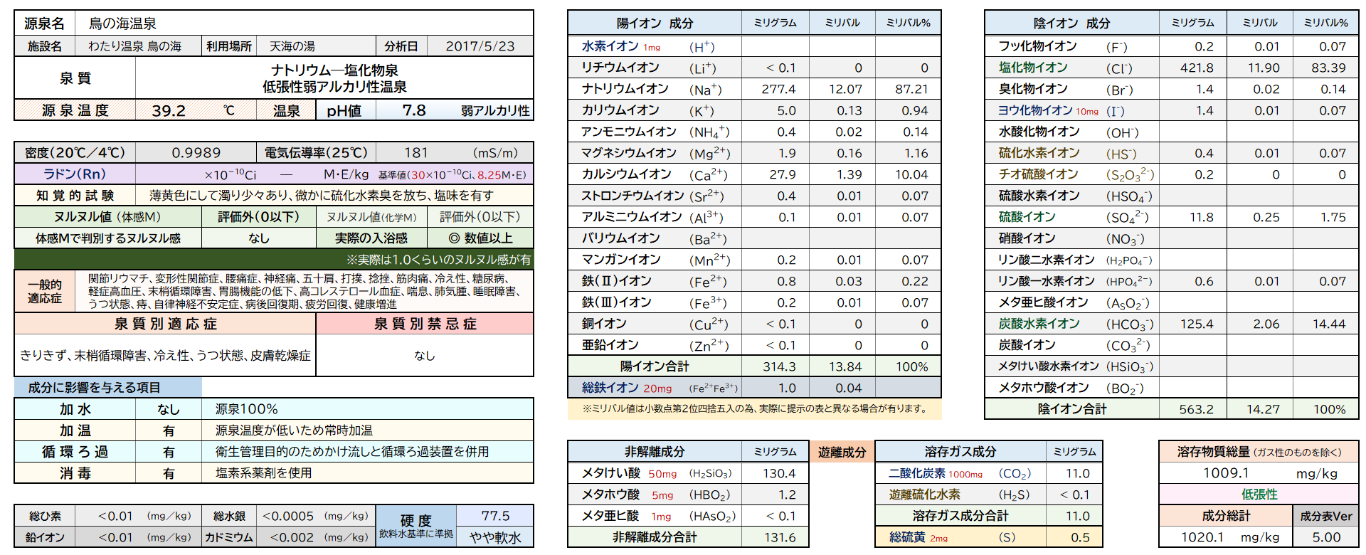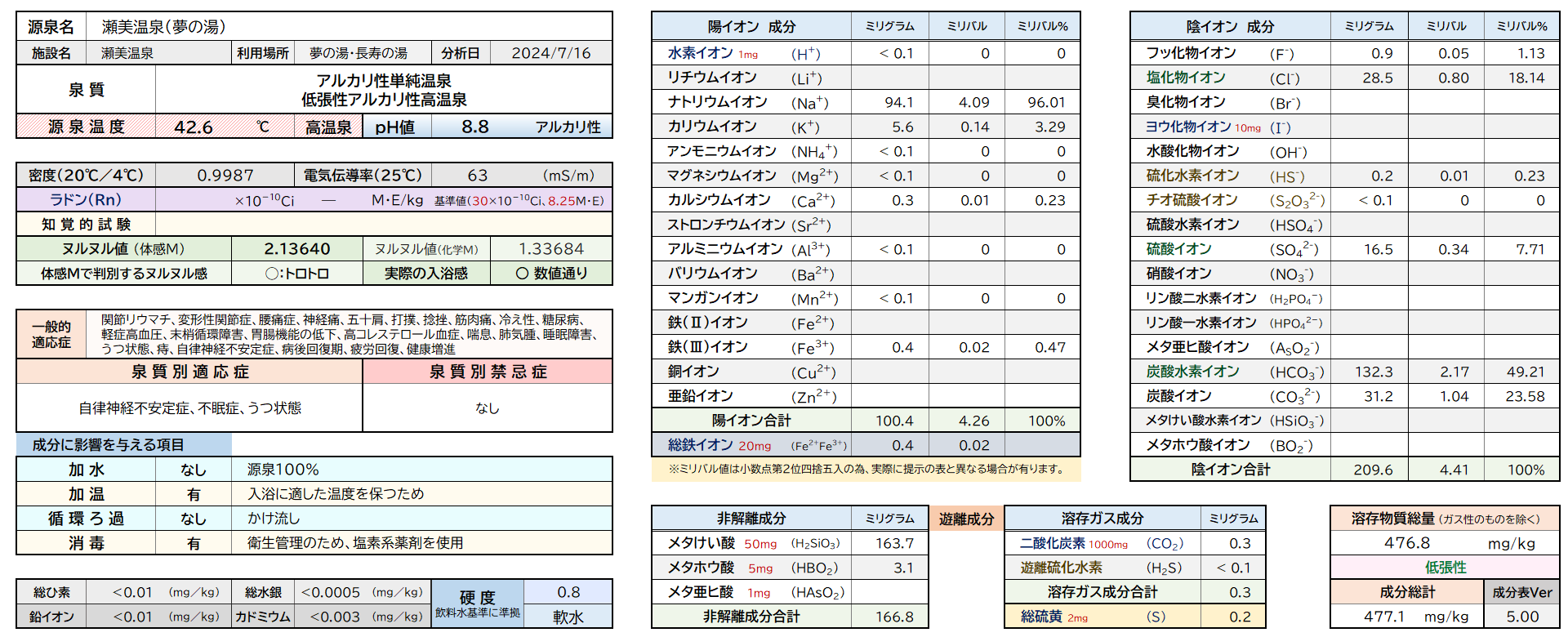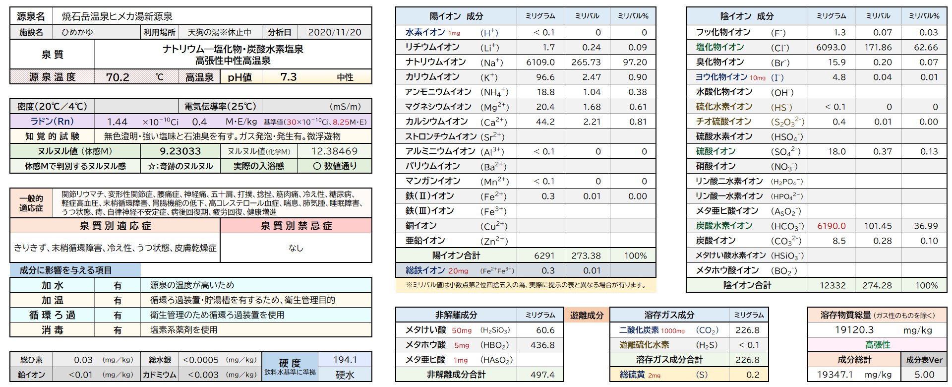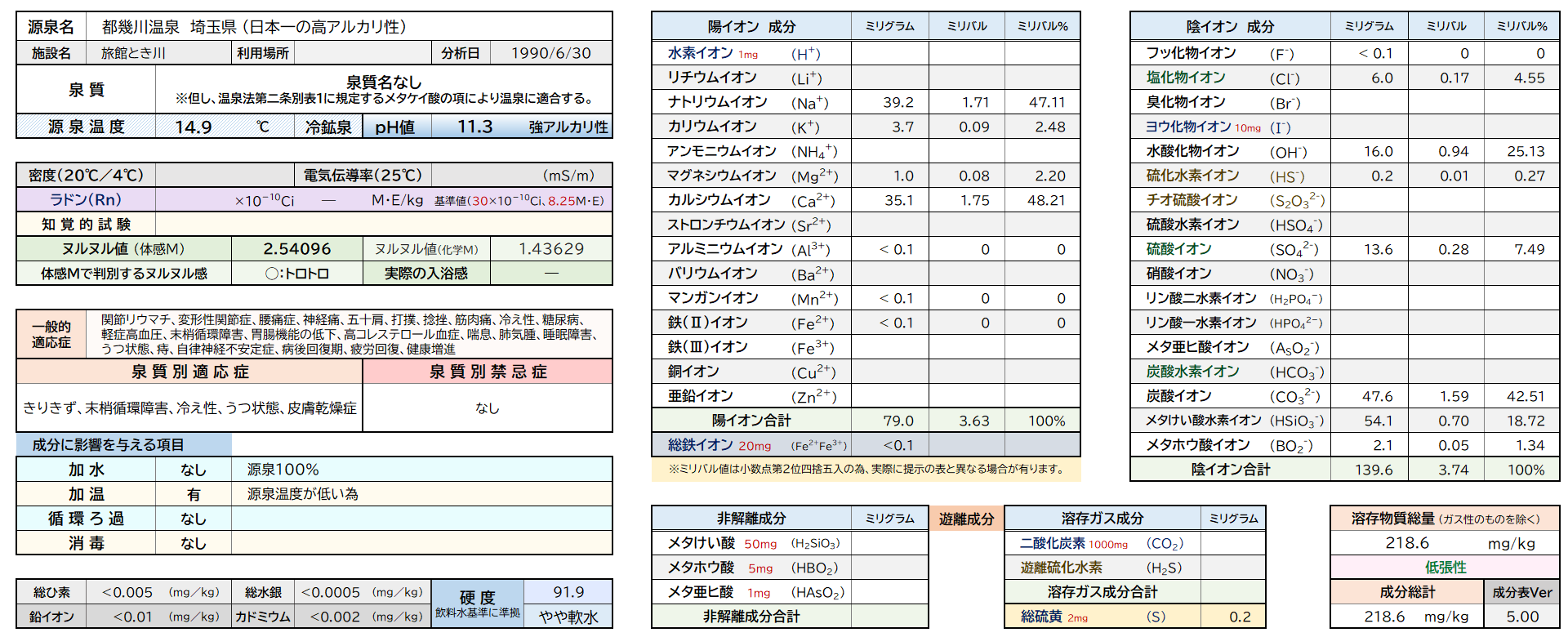 まだまだ紹介できていない施設が多い為、とりあえず測定のために作った成分表を置いておきます。
