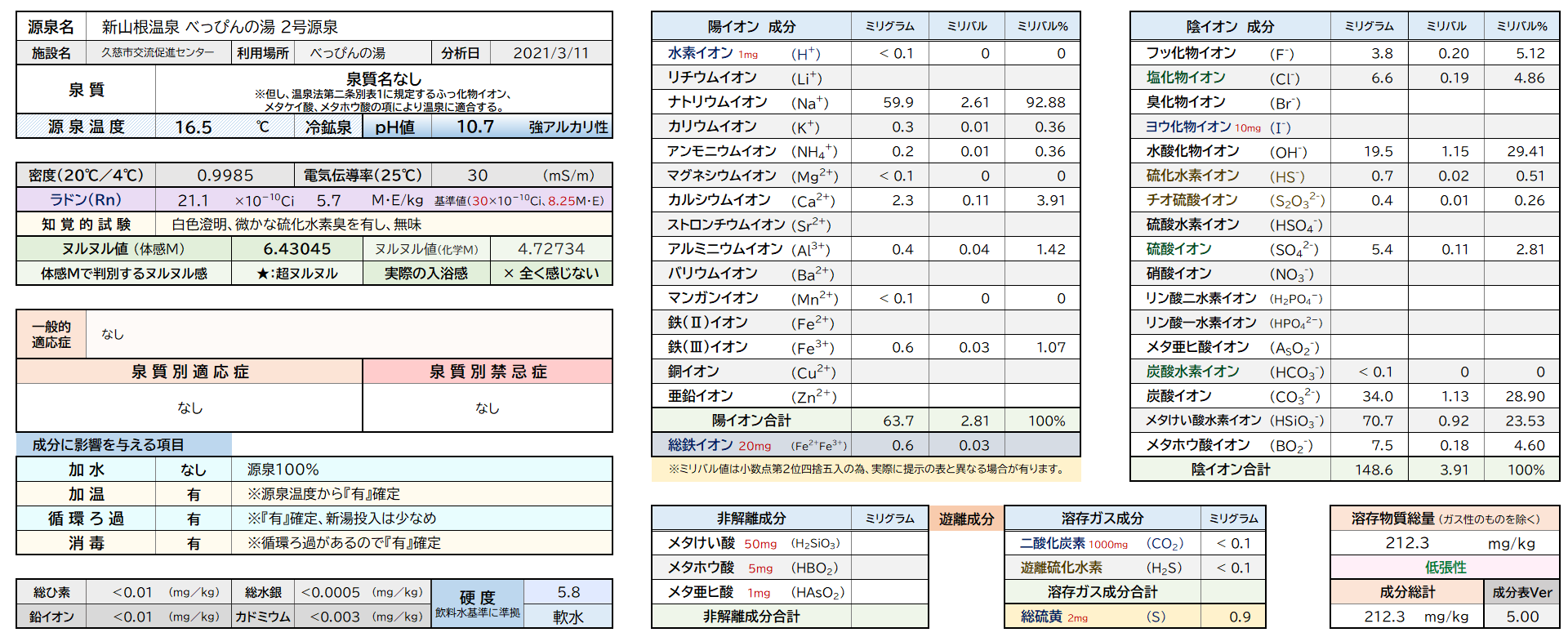 ついでに動画や成分表では分かりやすく「強アルカリ性」と記載していますが、温泉成分表に「強アルカリ性」という表記はなく、10を超えても「アルカリ性」の表記が正しいです。